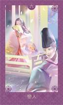 平安絵巻タロットの「戀人」は、惹かれ合いながらもどこか距離を保つ若い男女の姿が描かれています。
